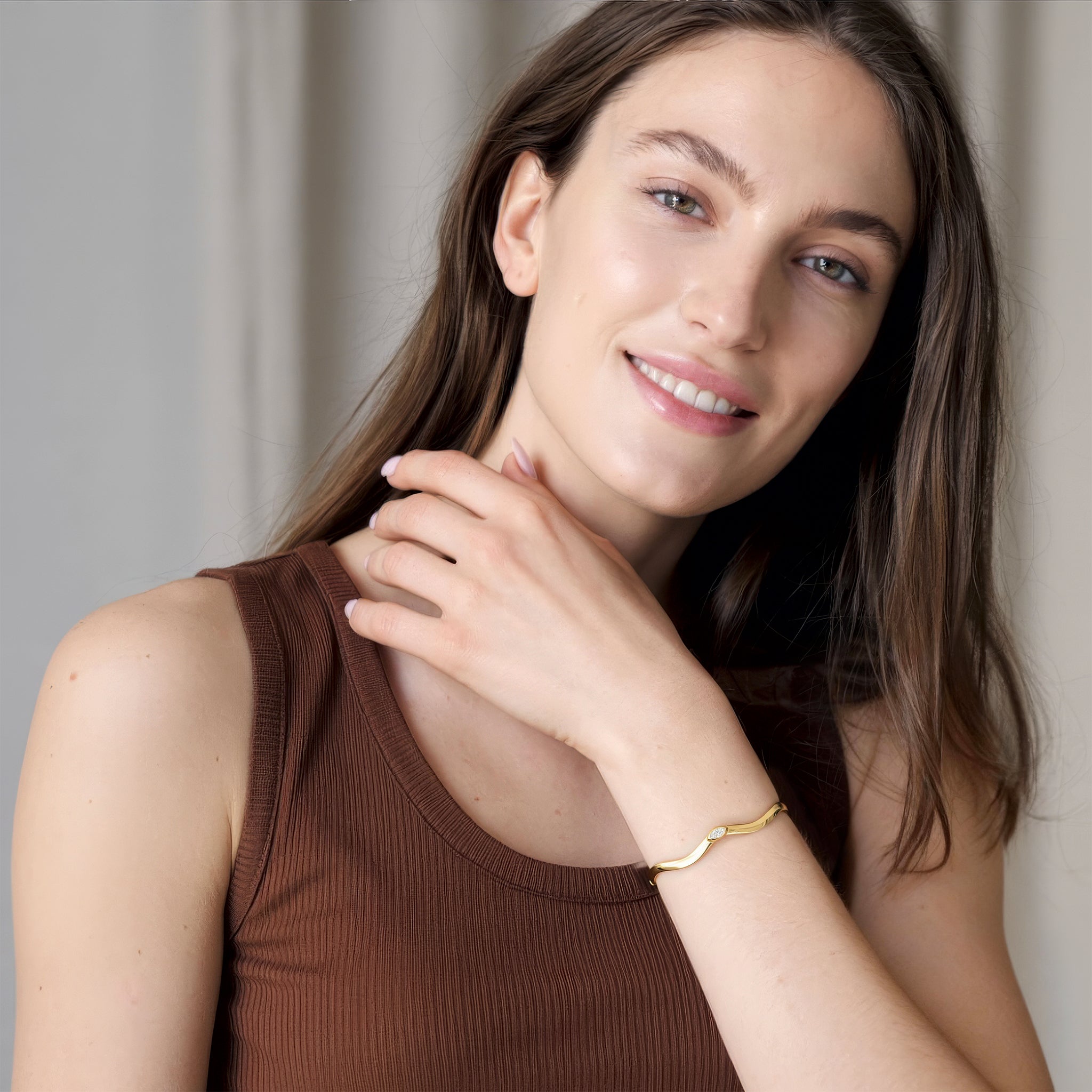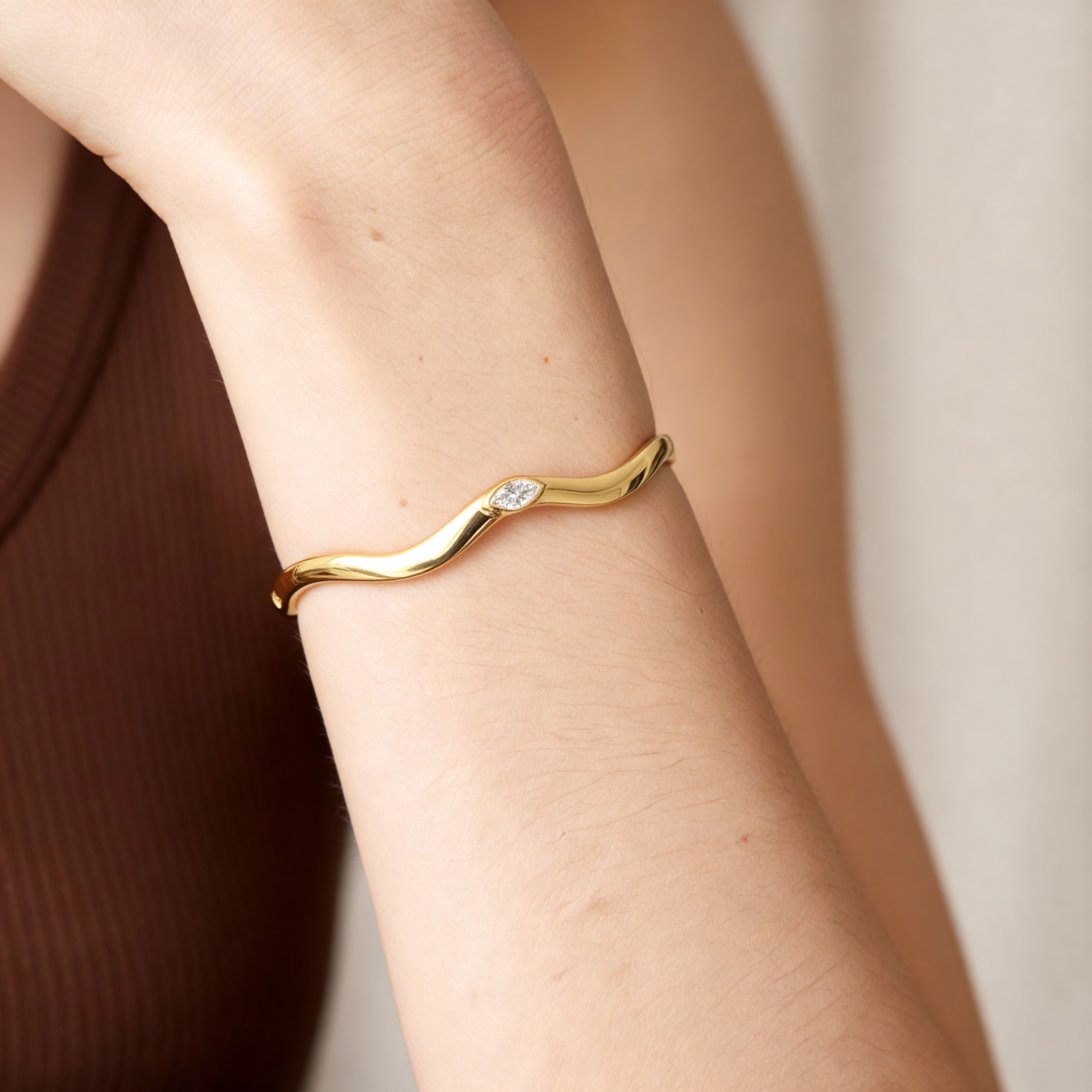 The Taylor Wave Bangle, named after Olivia's daughter, is our signature bracelet that is both customizable and sure to polish any look. Its wavy motif can become a staple piece for any wrist, stacking beautifully with your other bracelets.