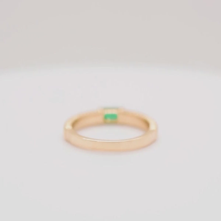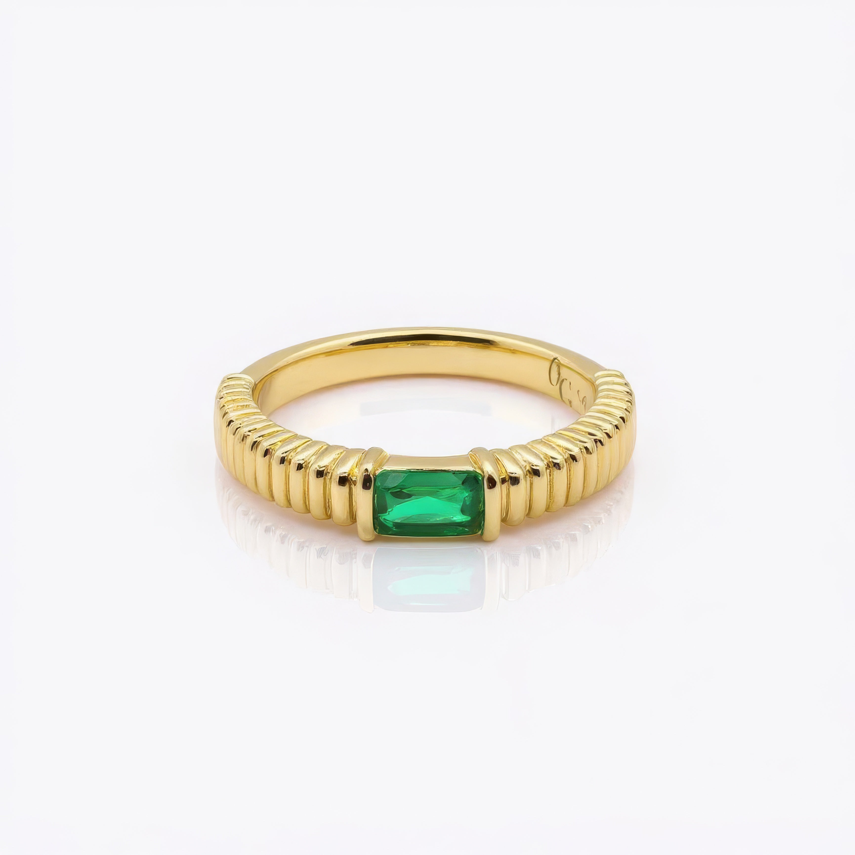 Solid 14kt gold in a geometric finish, this fluted stackable ring adds gleaming texture to your ring stack. Set with a gorgeous green, excellent-cut Emerald, this ring will shine and catch the light at every angle. Bold and sophisticated, meets beautiful and soft.