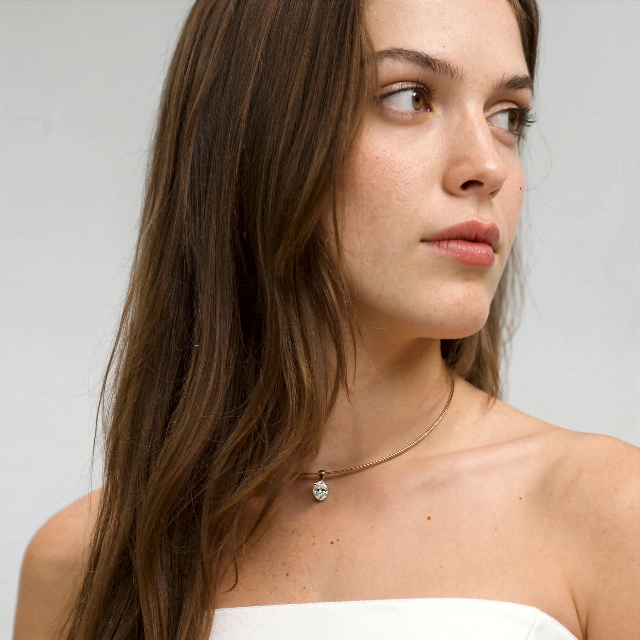 A complete show-stopper. Crafted in 14K gold, this necklace features a stunning 1 carat brilliant oval-cut lab-grown diamond with exceptional D color and VVS2 clarity, ensuring remarkable sparkle and quality. Set on a sleek 1.5mm omega chain with a 16-inch length, it offers a refined and polished aesthetic that complements any style. Complete with an IGI certificate for added assurance, this necklace is a timeless addition to any jewelry collection, perfect for special occasions or daily elegance.