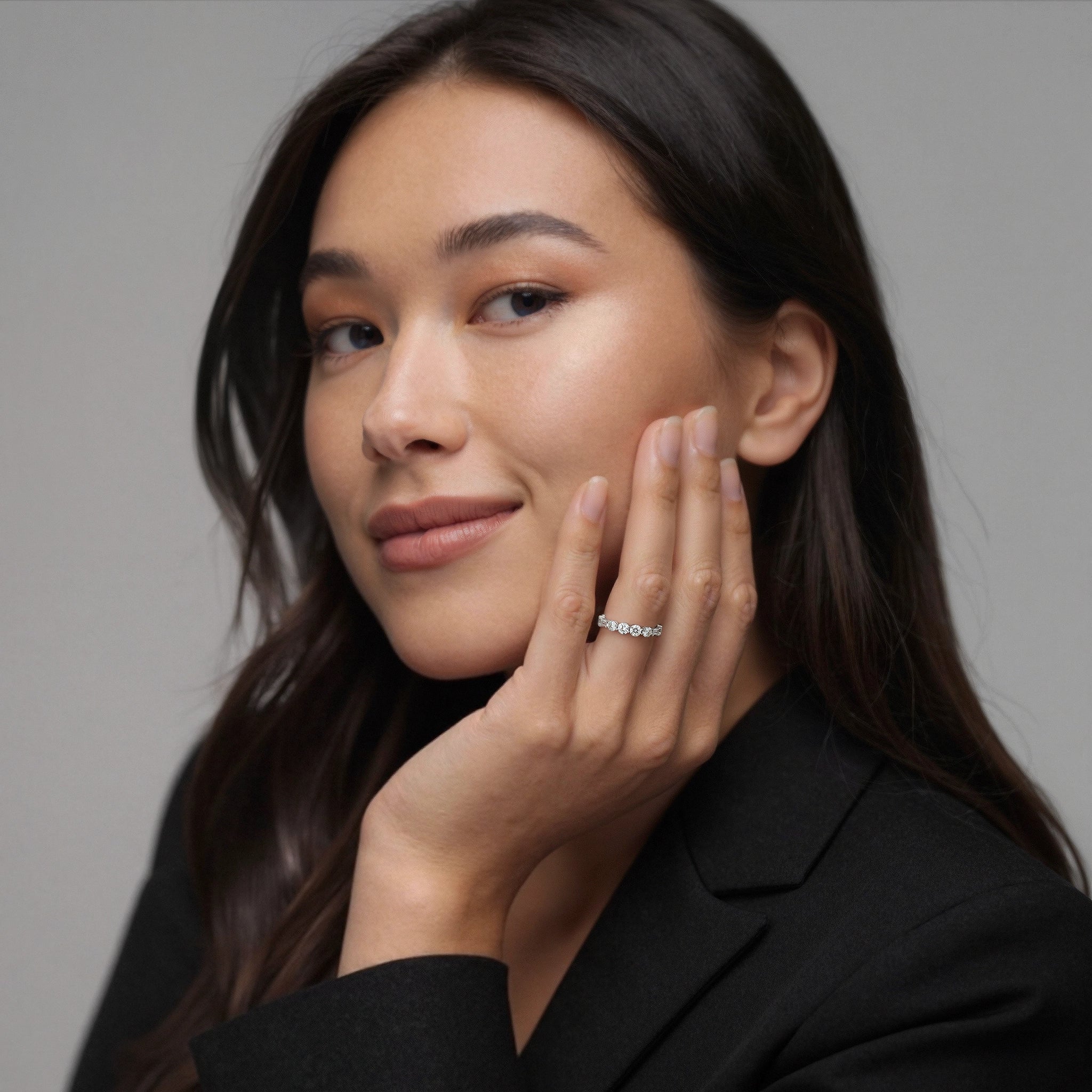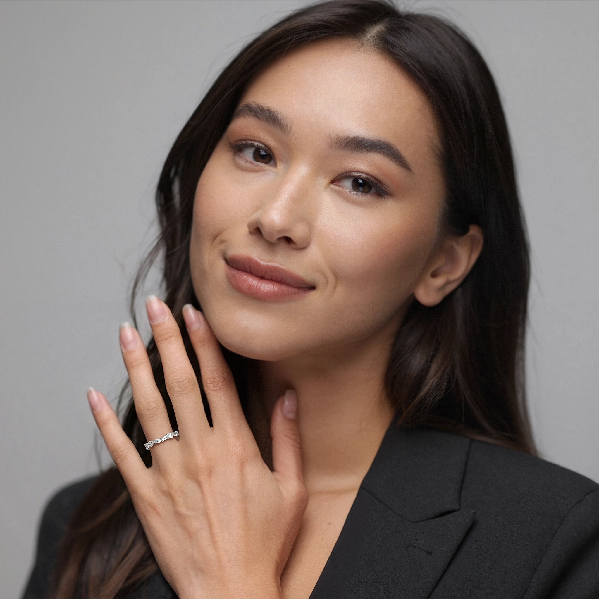 If forever can be captured in a piece of jewelry, it would be this gorgeous ring. The Olivia mixed-shaped diamond eternity band is a classic ring made with Rounds, Emeralds, Pears, Marquises, and Cushions set in a platinum setting. It is perfect for a wedding ring, anniversary ring, or just something for the everyday. She is the definition of glamour.