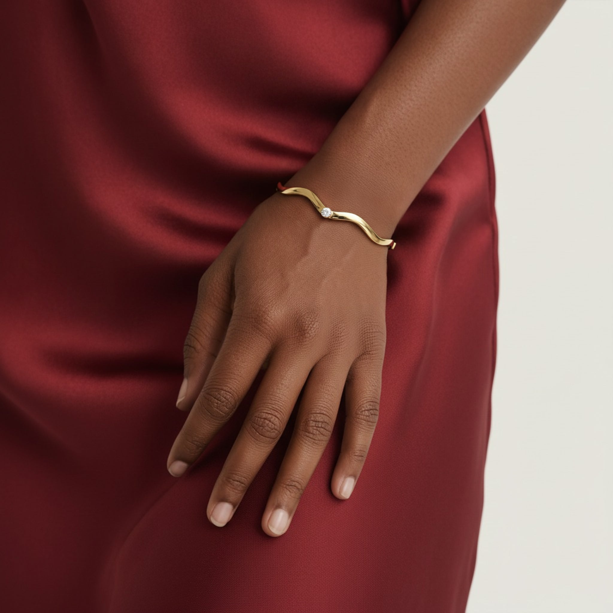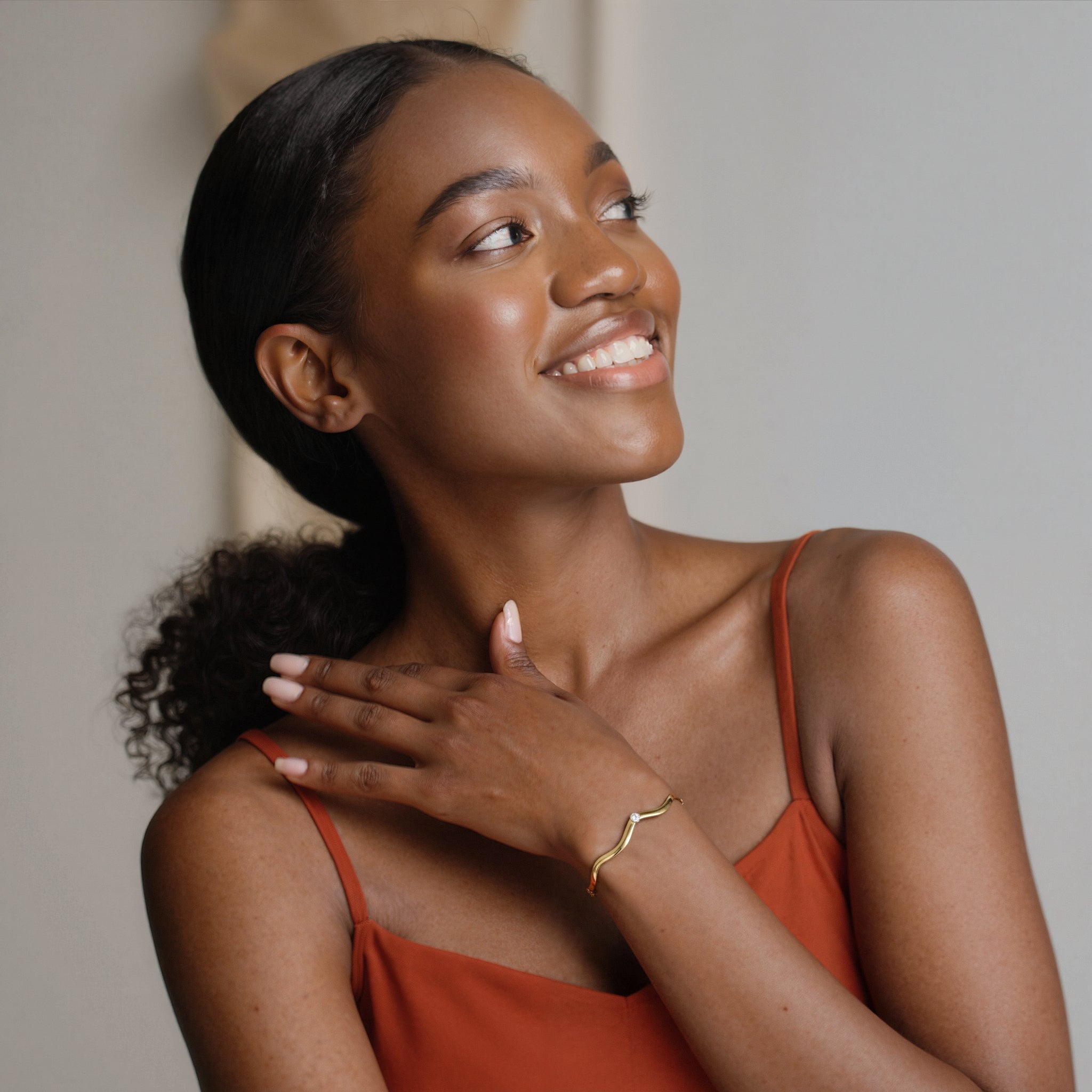 The Taylor Wave Bangle, named after Olivia's daughter, is our signature bracelet that is both customizable and sure to polish any look. Its wavy motif can become a staple piece for any wrist, stacking beautifully with your other bracelets.
